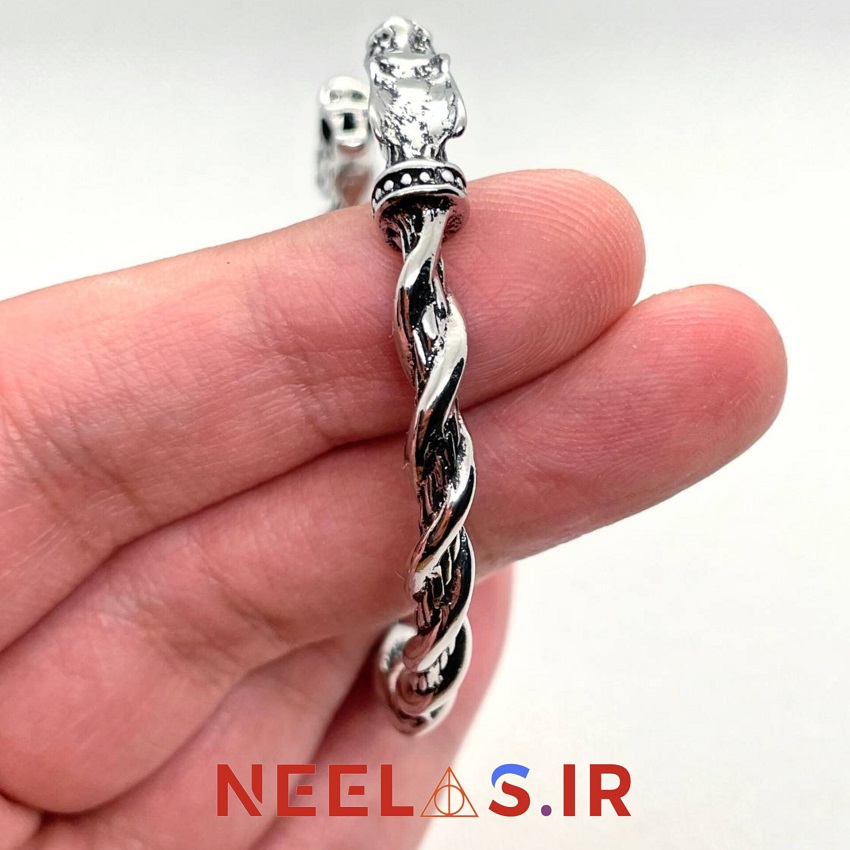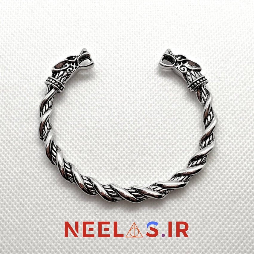 دستبند اژدهای سریال وایکینگ ها Vikings، این دستبند زیبا با طراحی مارپیچ در بدنه و دو سر اژدها در هر انتهای آن جلوهی بسیار زیبایی به نمایش درمیآورد. جنس آلیاژ فلزی آبکاری شده، قطر دستبند 6 سانت.