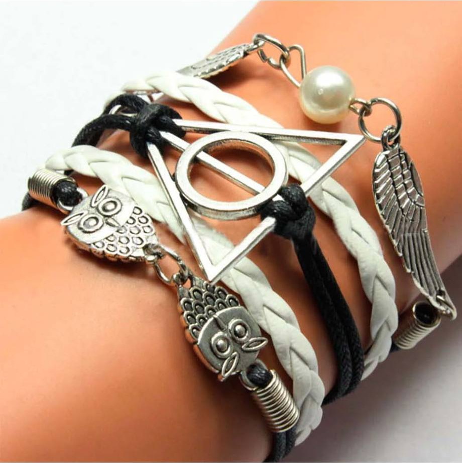 دستبند یادگاران مرگ، گوی زرین و جغد هری پاتر، دستند با بند چرمی و نماد های الهام گرفته از مجموعه هری پاتر، طراحی زیبا و جذاب مناسب مشکل پسندان. در سه رنگ قهوه ای، مشکی، سفید مشکی.