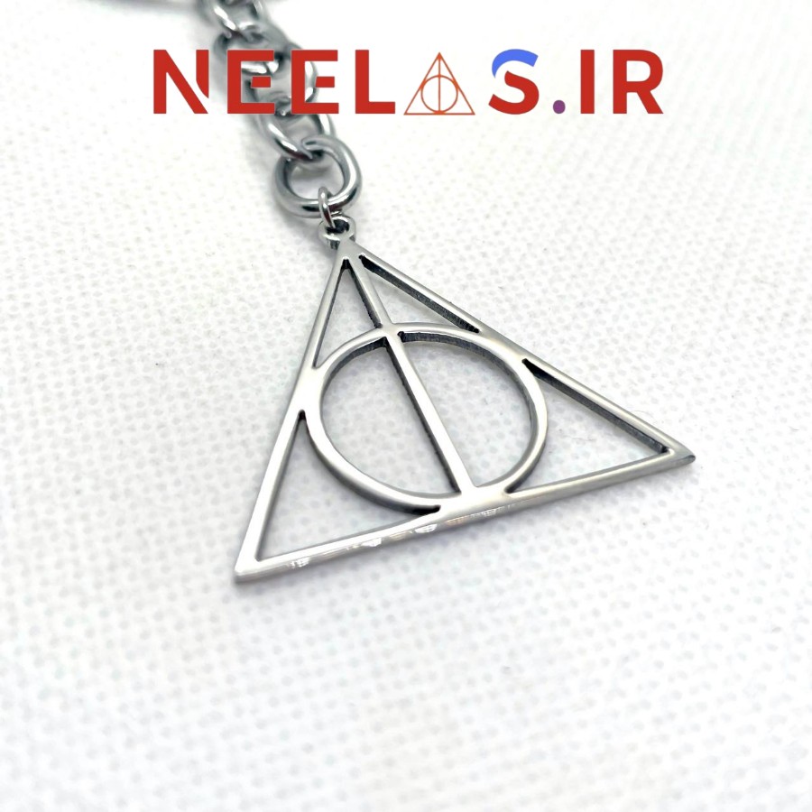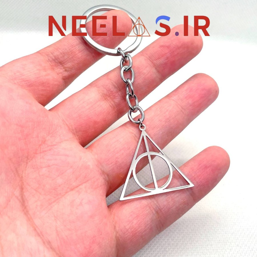 جاکلیدی و جاسوییچی استیل یادگاران مرگ از مجموعه هری پاتر، کیفیت بالا، برش لیزری، ابعاد پلاک 3 در 2.8 سانت، جنس استیل، رنگ ثابت، ضد حساسیت، ضخامت 1 میلی. طول جاکلیدی 9.5 سانت.