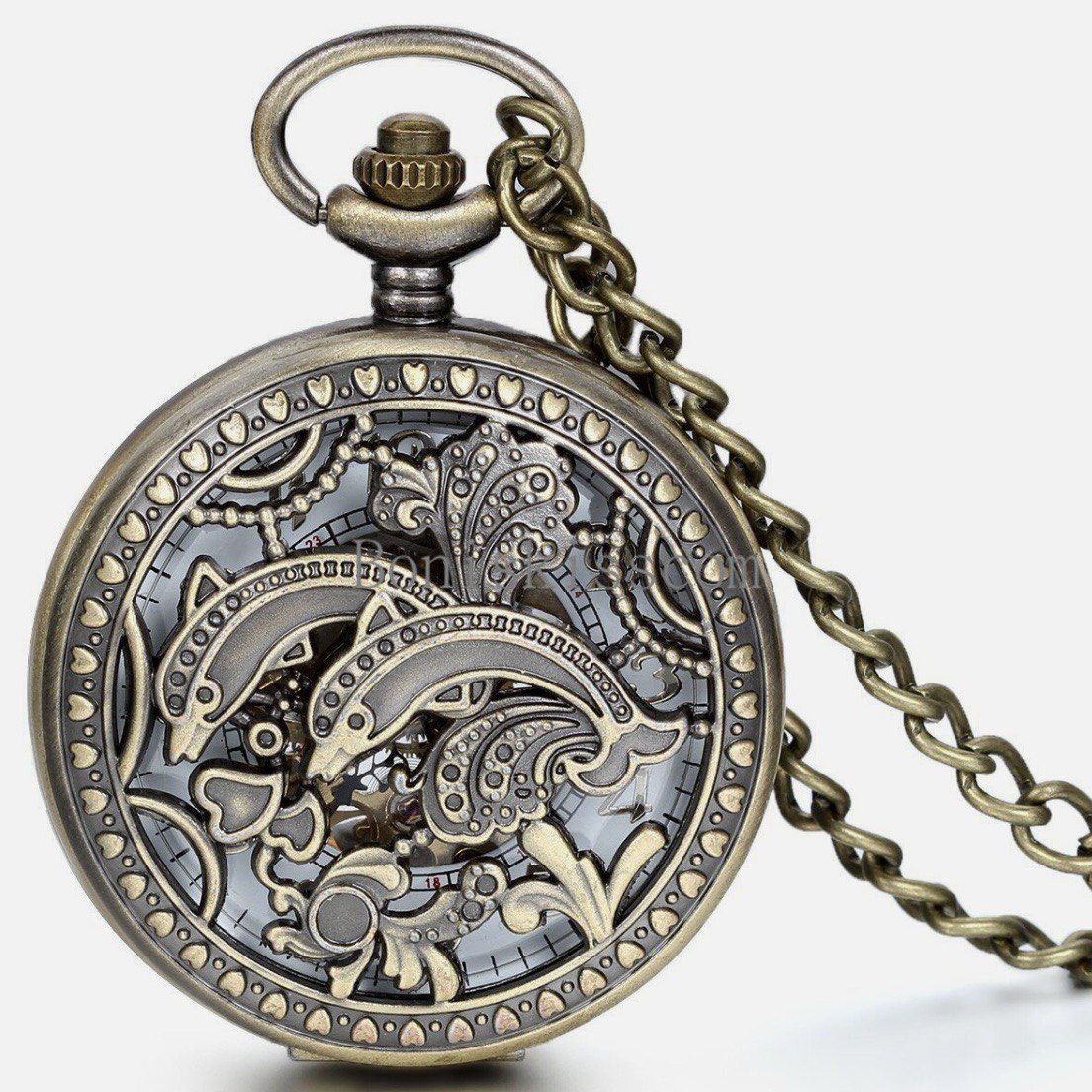 ساعت گردنبندی و جیبی طرح دلفین، طرح روی این ساعت یک جفت دلفین زیبا را به صورت برجسته نمایش می دهد. این ساعت به صورت گردنبندی و جیبی قابل استفاده است. کیفیت عالی تکنولوژی ساخت کوارتز. مناسب هدیه به هرکسی که دوستش دارید. باتری ساعت قابل تعویض است.