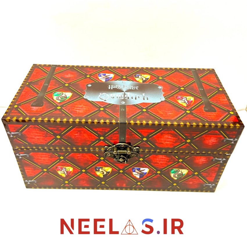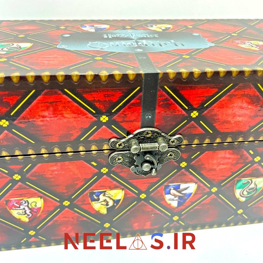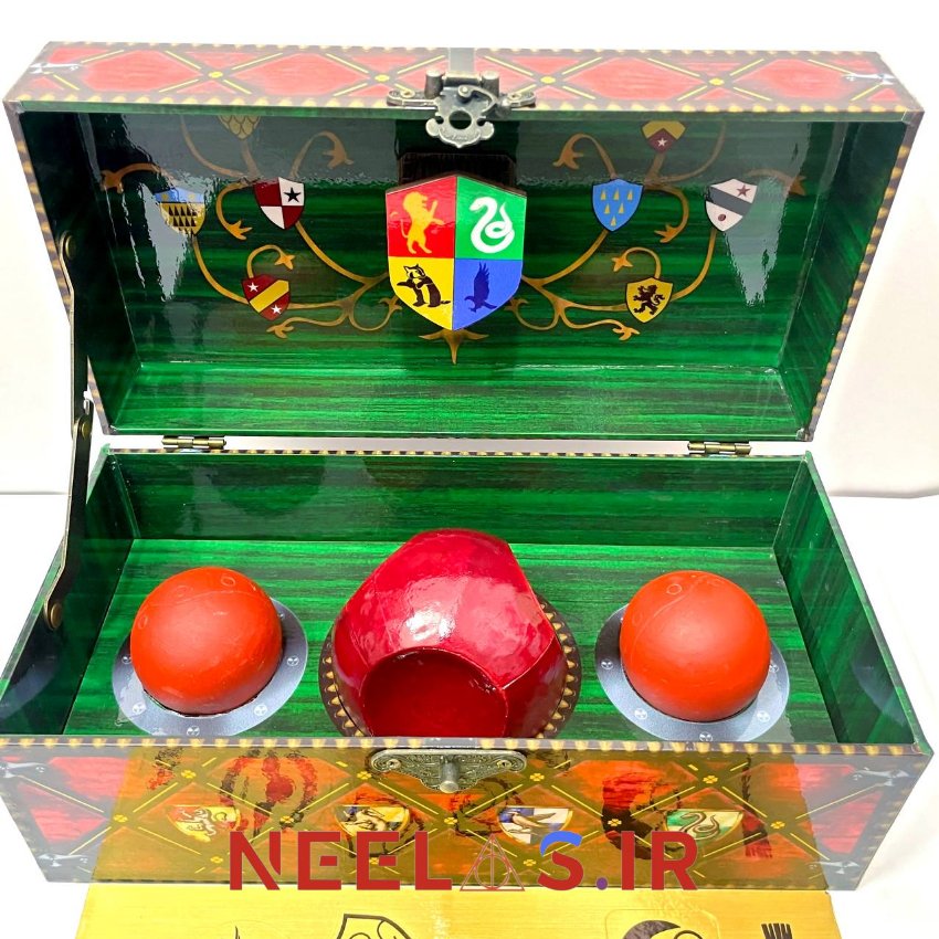 ✨ یک جعبهی چوبی کلکسیونی کوییدیچ – طراحی خاص با نشانهای چهار گروه هاگوارتز (گریفیندور، اسلیترین، ریونکلاو و هافلپاف) و قفل کلاسیک برای نگهداری ایمن توپها.
