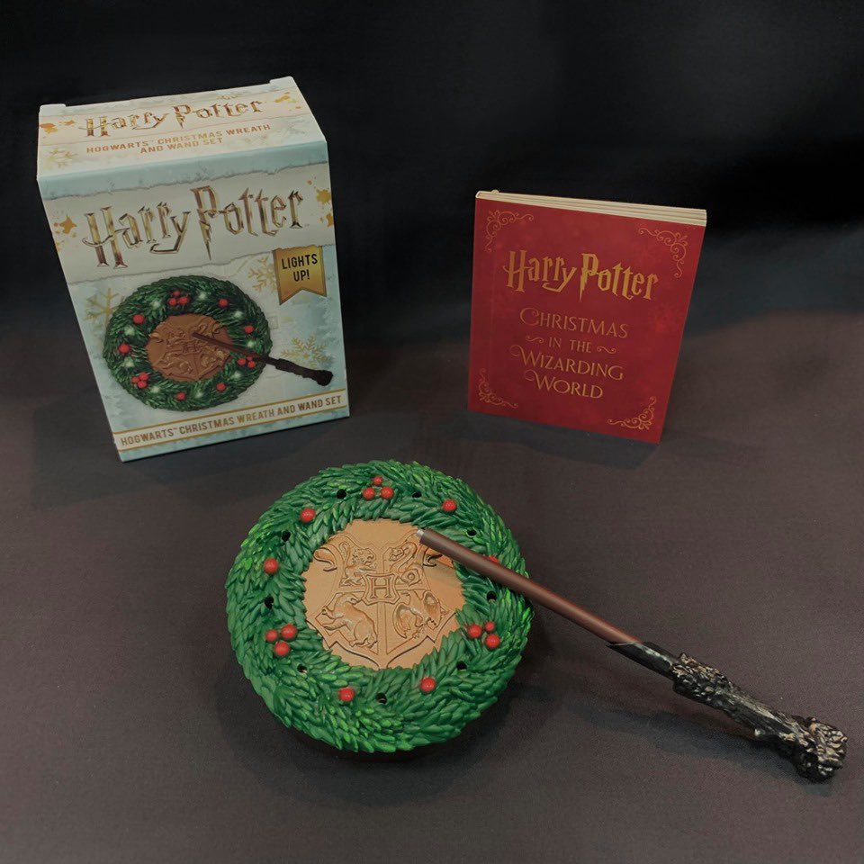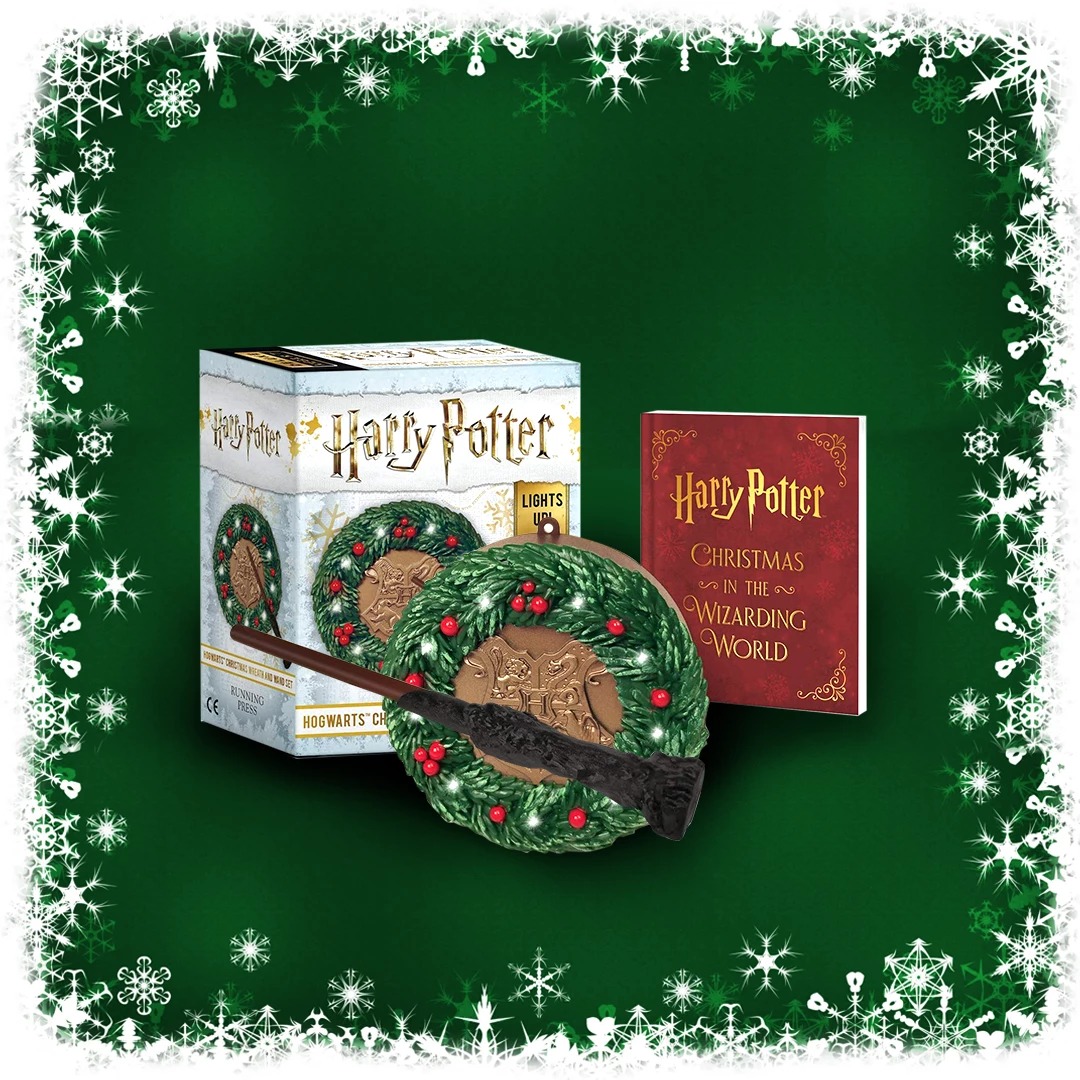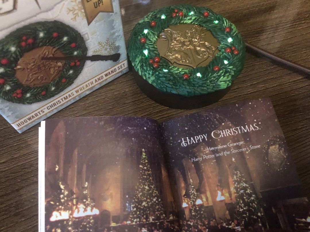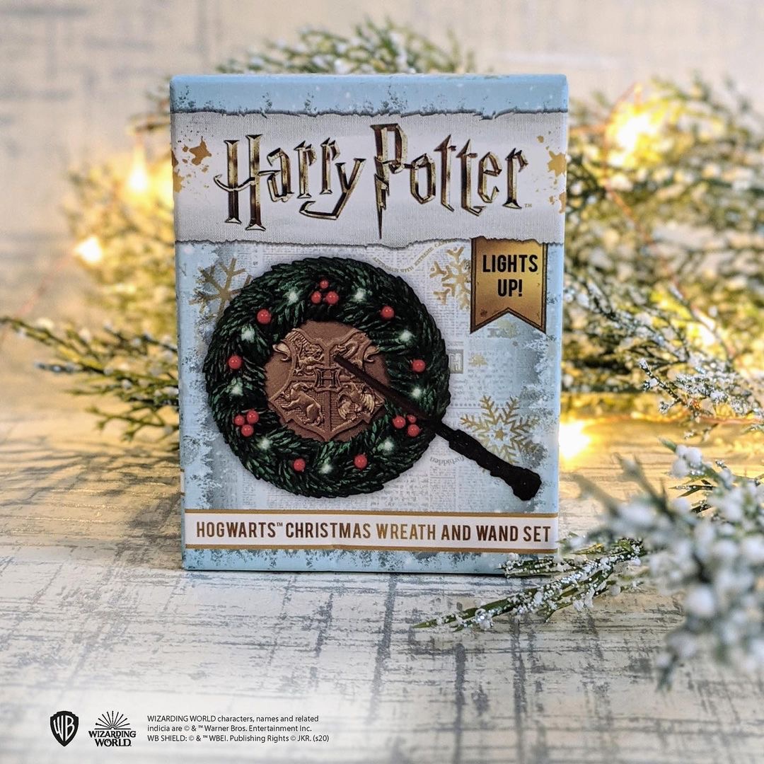 تاج گل 3 اینچی کریسمس با نماد مدرسه جادوگری هاگوارتز در مرکز ماکت، چوب دستی هری پاتر 4 اینچی که وقتی از نزدیک در مقابل تاج قرار می گیرد، چراغ های روی تاج گل فعال می شود و کتاب 48 صفحهای درباره کریسمس در دنیای جادوگری، که شامل عکسهای تمام رنگی است، محصول نیازمند به دو باتری قلمی AAA است. (درون جعبه باتری نیست).