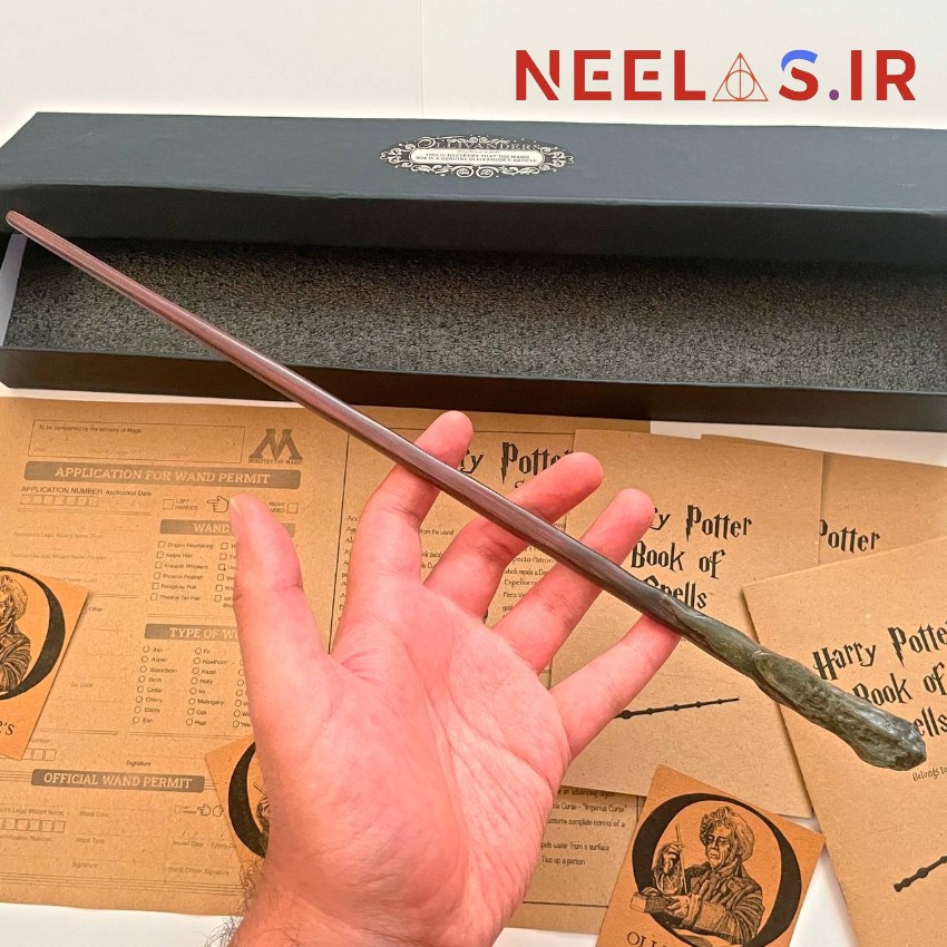 چوبدستی از جنس رزین سخت درجه یک با هسته فلزی با کیفیت بالا و جزئیات بسیار دقیق طراحی شده، طول حدود ۳۷ سانت، مقاوت بسیار بالا، وزن سنگین، چوبدستی به وسیله جعبه هارد باکس به ابعاد ۴۲ در ۷ سانتی متر محافظت می شود، سایر اقلام موجود در این پک: مجوز حمل چوبدستی از وزارت سحر و جادو، پوستر افسون ها هری پاتر و دفترچه آموزش اجرای افسون ها و حرکات چوبدستی است. مناسب پاترهدها، کلکسیونر ها و هدیه به طرفداران دنیای جادویی هری پاتر.
