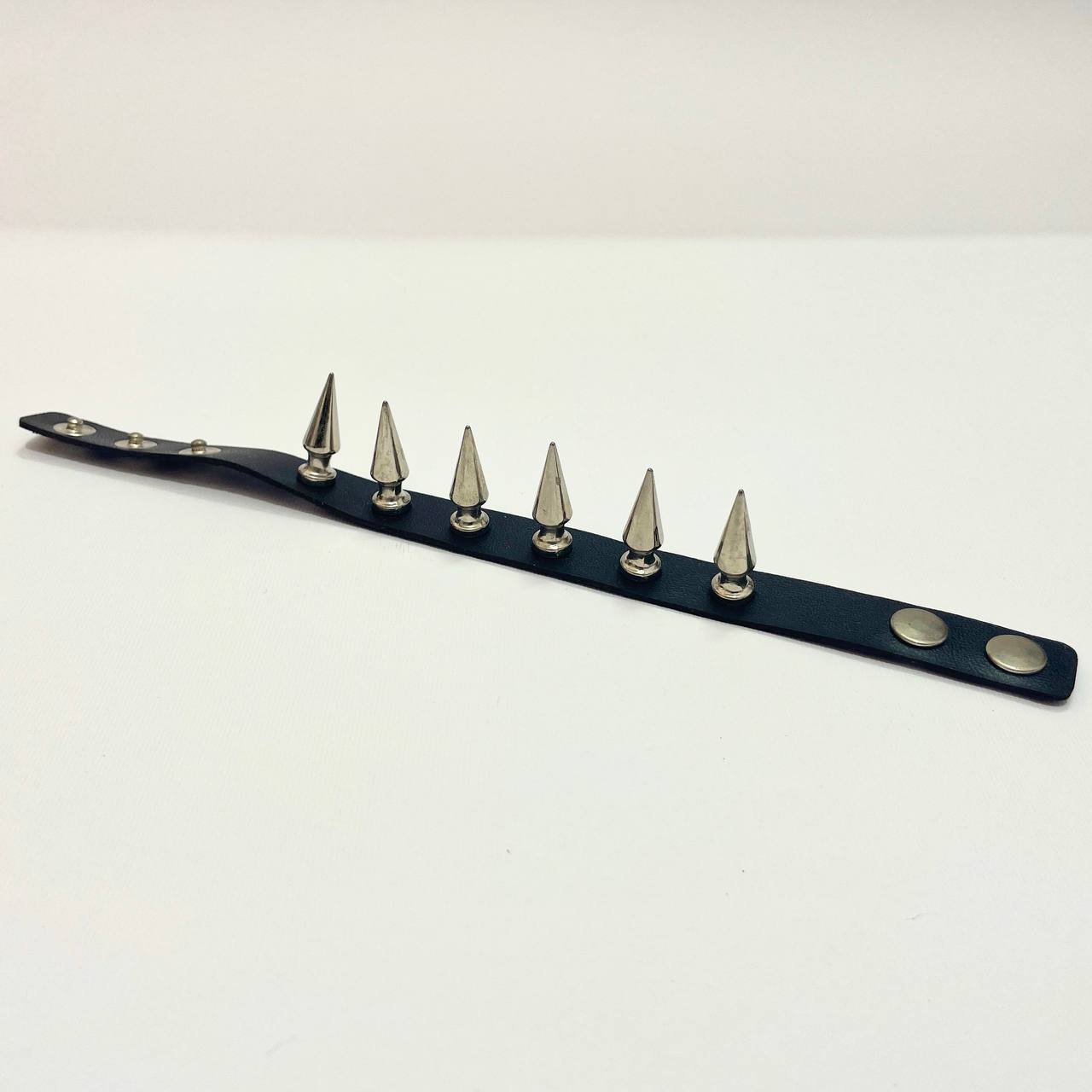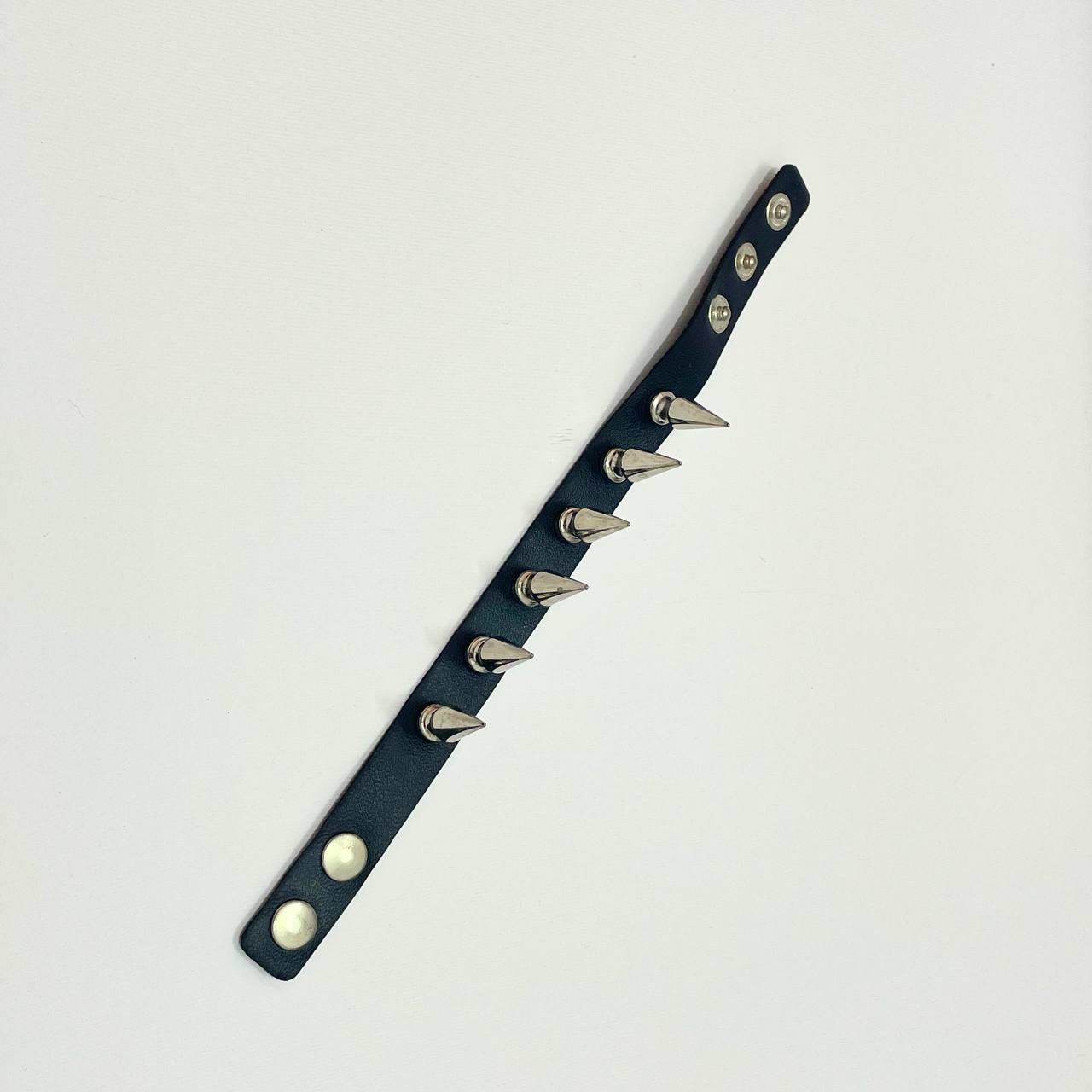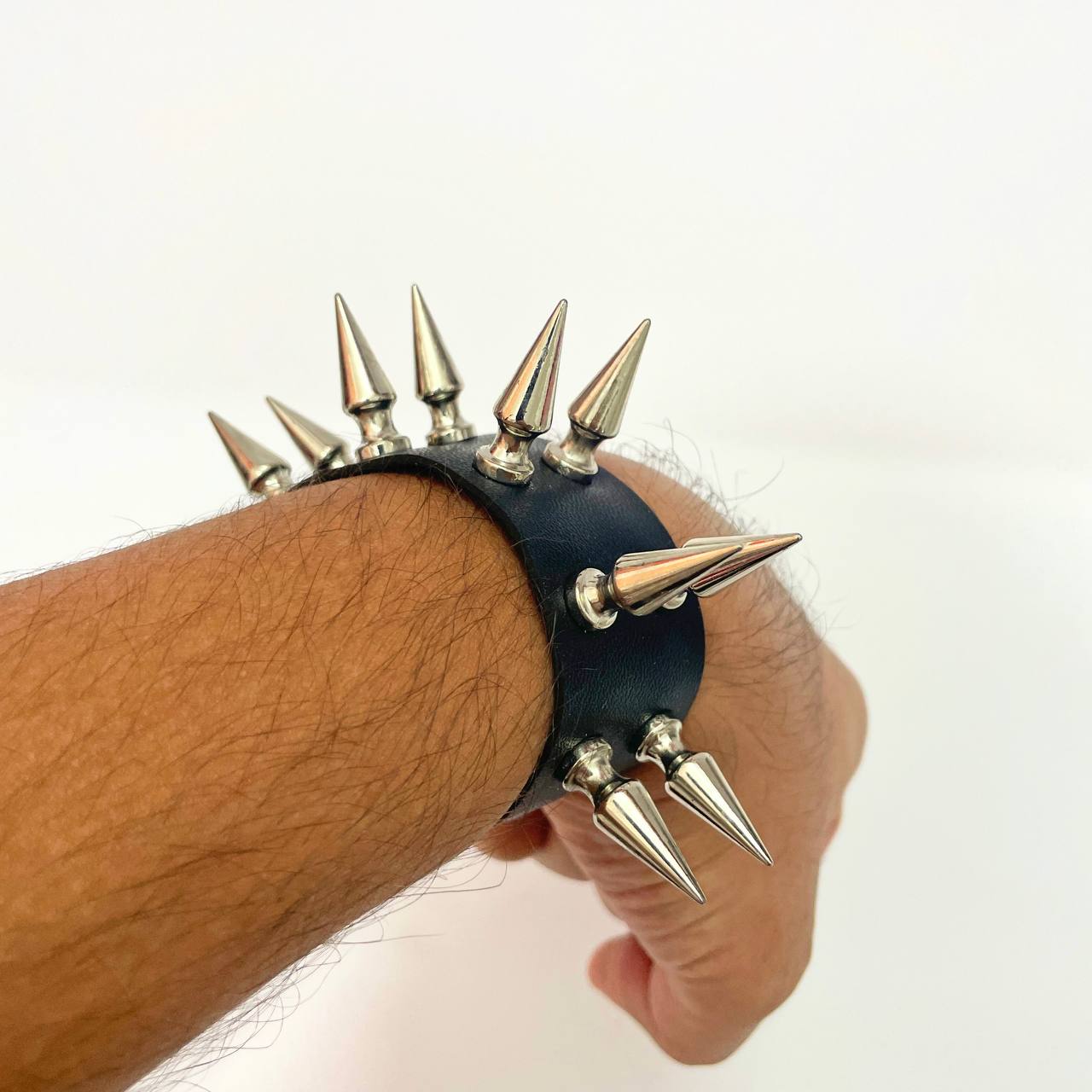 دستبند چرمی اسپایک دار، این دستبند چرمی با اسپایک های فلزی براق، نمادی از قدرت، جسارت و استایل راک و پانک است. از چرم مصنوعی با کیفیت ساخته شده و دارای بست قابل تنظیم برای انواع مچهاست.