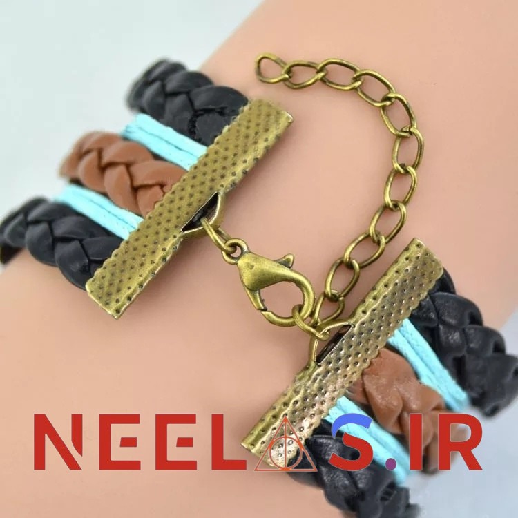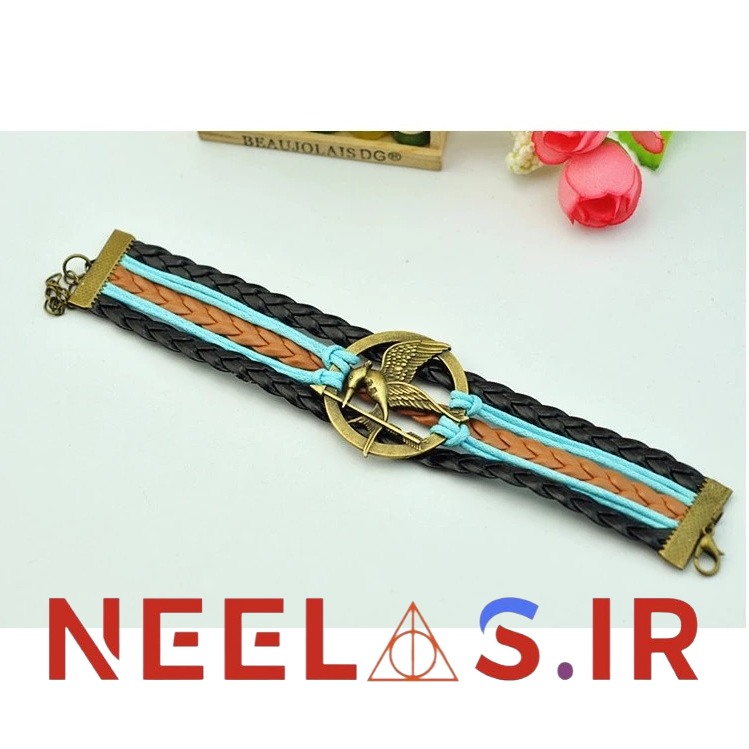 دستبند زاغ مقلد در بازی های گرسنگی، این دستبند زیبا با ترکیبی از بندهای بافتهشده چرمی در رنگهای مشکی، قهوهای و آبی روشن، دارای پلاکی فلزی با نماد مشهور زاغ مقلد (Mockingjay) است؛ پرندهای که تیر را در نوک گرفته و درون حلقهای فلزی قرار دارد.